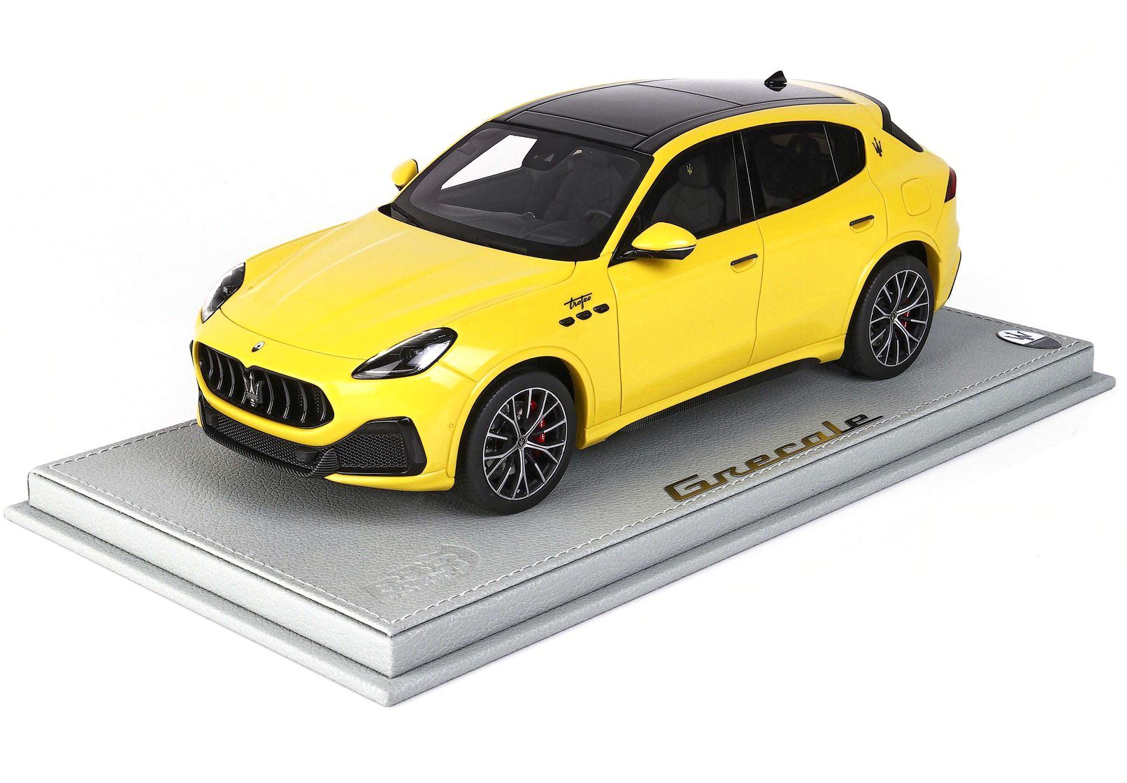 Exkluzivní sběratelský model sportovního SUV Maserati Grecale Trofeo ve žlutém provedení, vyroben exkluzivní italskou značkou B.B.R. Models v měřítku 1:18. Verze Trofeo představuje vrchol nabídky modelu Grecale a kombinuje luxusní charakter s výrazným sportovním výkonem typickým pro značku Maserati.