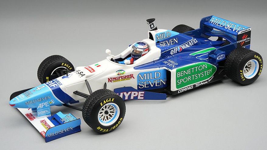 - Benetton F1 B196 Team Renault Mild Seven #4 G.Berger Spanish GP 1996 Rain Tyres with Pilot Figure 1:18 Tecnomodel